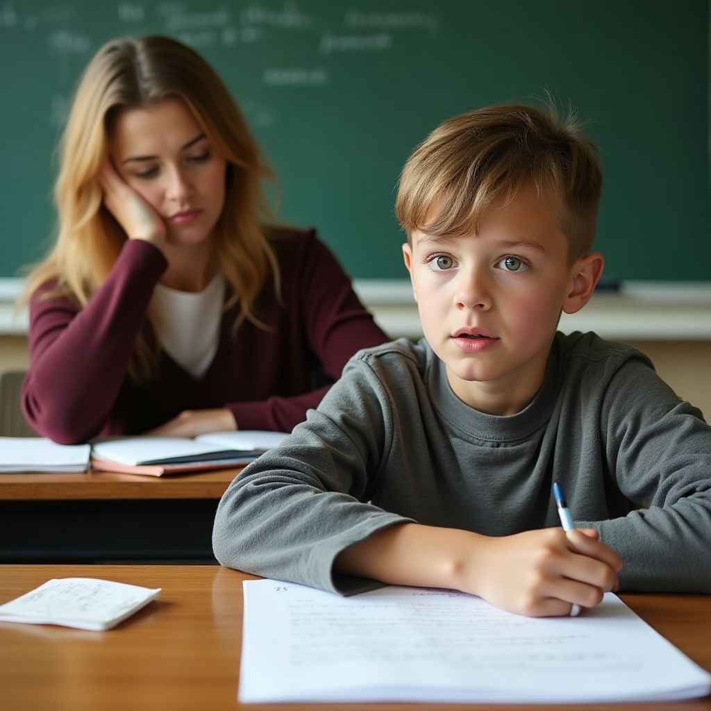 Учительница подходила к парте, на которой лежала записка, пробираясь между рядами старых парт и школьных стульев. «Максим, почему ты оставил это?» — тихо спросила она, замечая дрожь в его руках. «Я просто хотел, чтобы кто-то узнал правду», — ответил он с хрипотой. В классе пронесся легкий шепот — «Что там?» — здесь, «Неужели…?» — там. Неловкость заполняла пространство, а взгляды детей становились всё тяжелее и внимательнее.