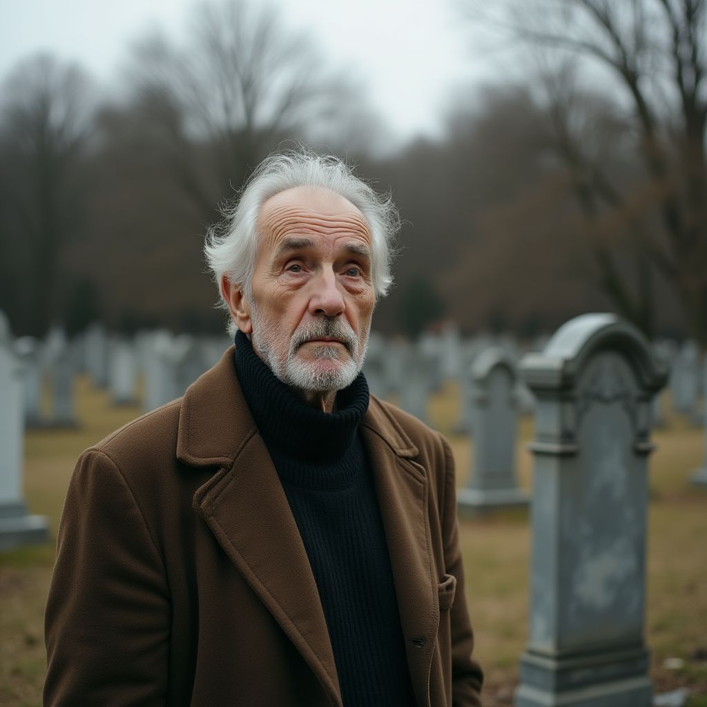 Пожилой мужчина медленно шёл по разбитой дорожке, его плечи были сгорблены, взгляд — усталый и блуждающий. Глубокие морщины прорезали лицо, а седые волосы едва закрывали виски. Он был одет скромно — поношенный тёмный плащ, потертые ботинки и аккуратный, но старомодный шарф. Каждая его походка казалась тяжёлой, будто сама судьба давила на него невидимым грузом. В руках крепко сжимал он небольшой букет увядших полевых цветов, неярких, но бережно собранных. Всё вокруг казалось чуждым, но он был здесь неслучайно — возвращение после долгих лет разлуки было мучительно необходимым.