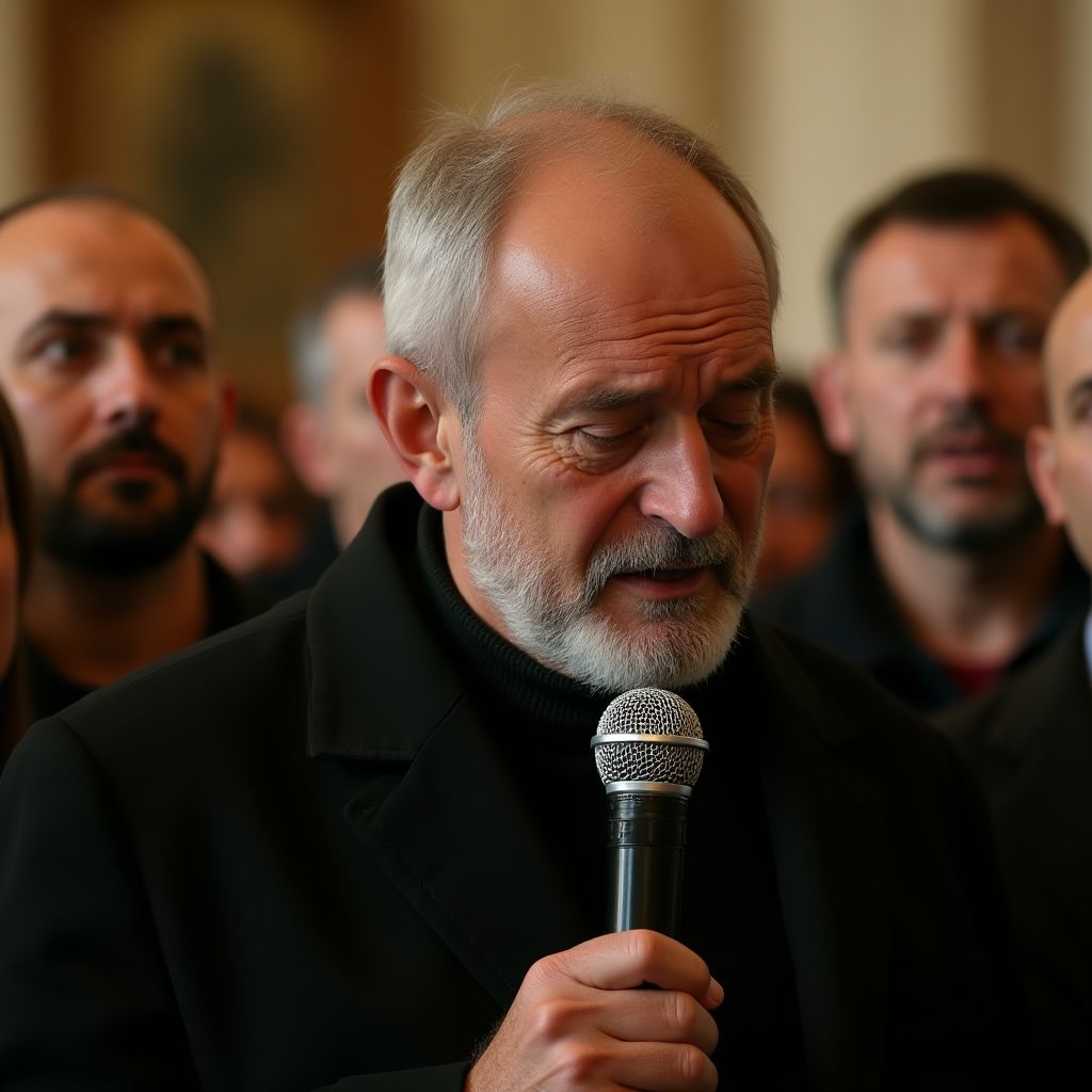 В углу зала стоял отец — мужчина невысокого роста с ослабевшей, но гордо выпрямленной спиной. Его лицо было изрезано морщинами времени, а седые волосы едва прикрывали лысину на темени. На нём была старая, но аккуратная серая куртка, под которой просматривалась простая рубашка — одежда простого, но честного человека из рабочего класса. Его глаза, спокойные и глубокие, отражали смесь боли и непоколебимой решимости. Медленно сжав дрожащие руки в кулаки, он приближался к микрофону, словно собираясь перевернуть всё, что было до этого момента.
