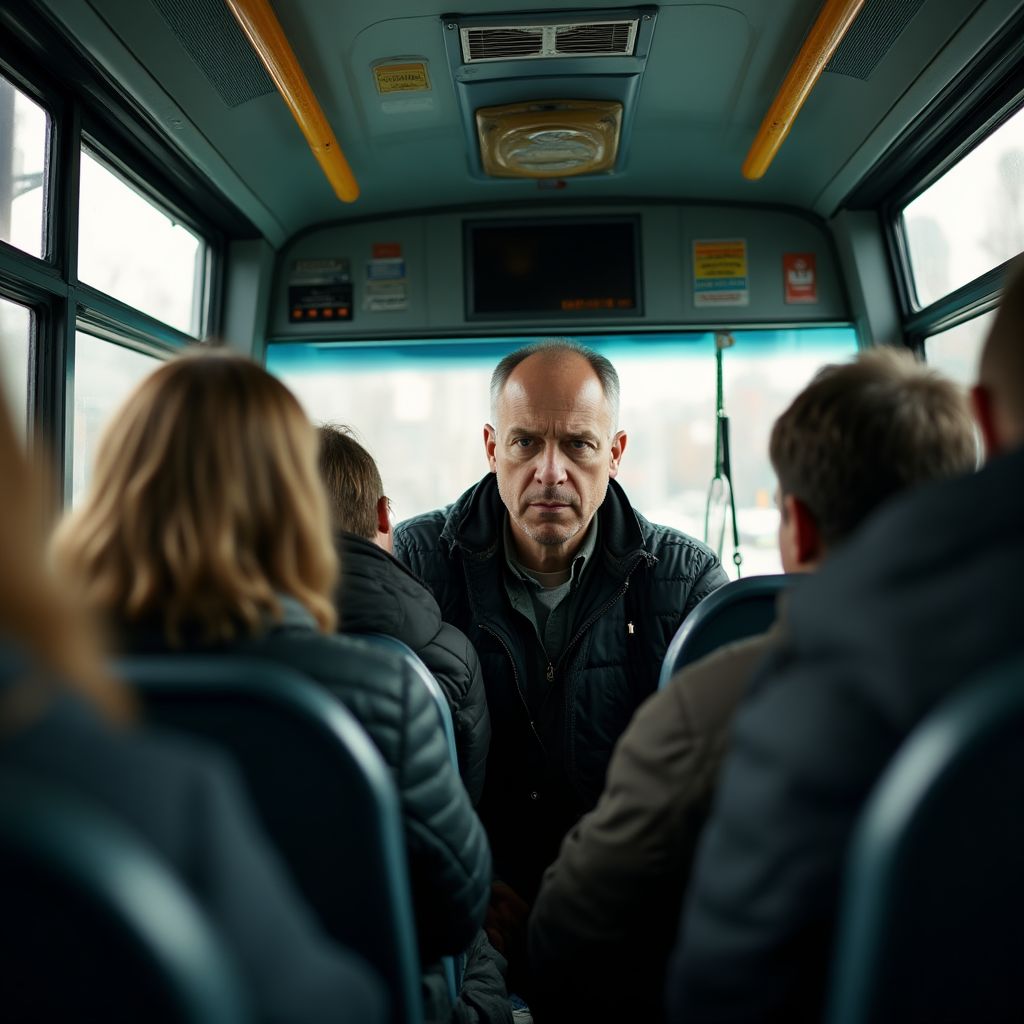 Водитель остановил маршрутку на обочине. Он резко повернулся к пассажирам, чьи взгляды скользнули между собой в растерянности. Его лицо напряжено, а дыхание прерывисто.
