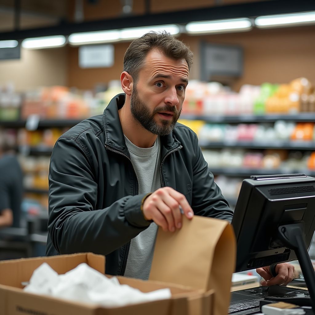 — Всё для вас, — ответила кассирша, накладывая товары на ленту. Вдруг она заметила тяжёлый пакет, едва заметно торчащий из его сумки.