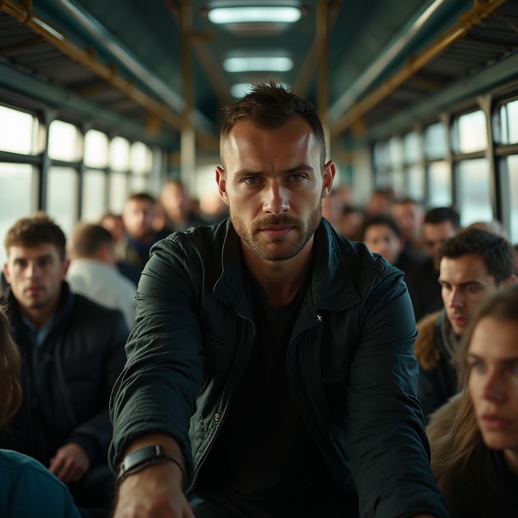 Алексей стоял у входа в автобус с осанкой, которую пытался сохранить, несмотря на изношенную куртку и поношенные ботинки. Его глаза – тёмные и напряжённые – быстро сканировали каждого, кто входил и выходил. Рост около 180 сантиметров, лицо с лёгкой щетиной и глубокими морщинами вокруг глаз, будто он прожил тысячи историй в этих стенах. Он был ветеран, которого жизнь не жалела, но горел искрой внутренней силы и бескомпромиссной смелости.