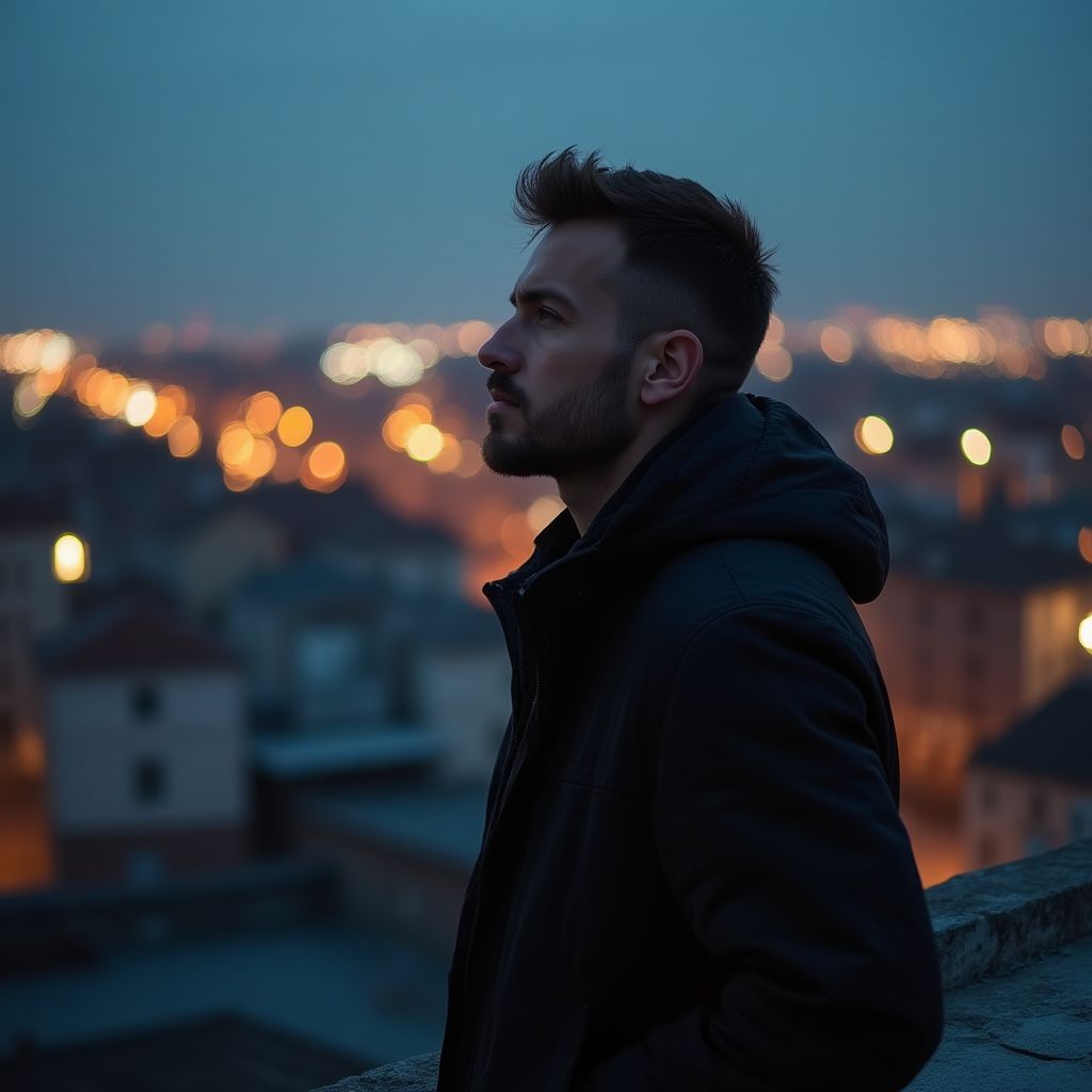 Вечер опускался на город, окрашивая небоскрёбы в глубокий багрово-фиолетовый цвет. Холодный ветер неожиданно прорывался из-за дальних улиц, принося с собой резкий запах асфальта и едва уловимый аромат горелой резины. Небо затянули густые тучи, и редкие мерцающие огни фонарей казались тусклыми точками в морской черноте города. Мужчина стоял на крыше дома, высоко над шумным улицей, где каждый звук эхом отдавался в тишине ночи. Его пальцы сжимали холодный перила, а ноги покоились на прохладной бетонной плите. Горячий воздух его памяти вспыхивал ярче, чем огни далёкого мегаполиса — словно ночь сама хранила тайну, которую он собирался раскрыть.