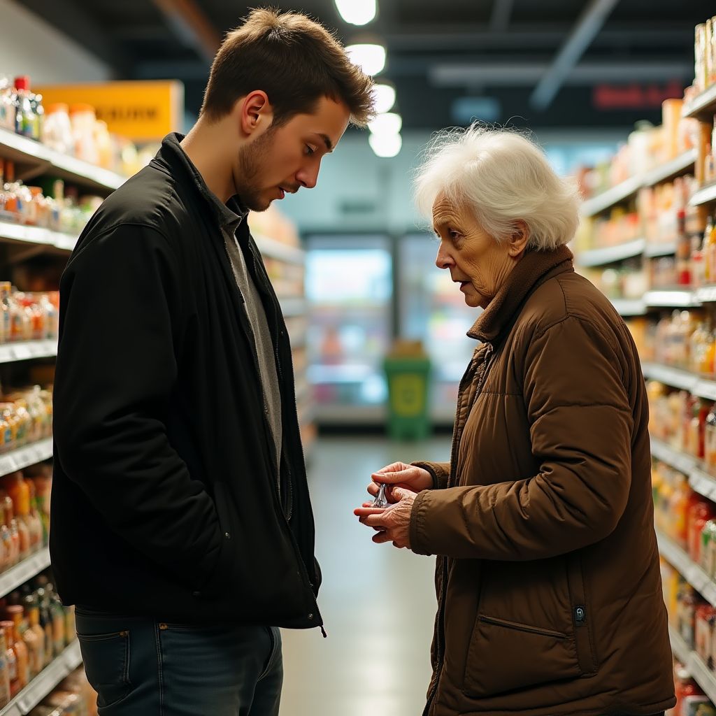 Сегодня Андрей чувствовал себя особенно угнетённым. Уже третий час смены, ноги гудели от постоянного хождения по проходам. Мысли рвались к дому, к матери, но чувство долга не давало отвлечься. «Сколько ещё таких дней?» — мелькало в голове. Вокруг него сплошные таящие надежды и тревоги лица тех, кто шел за куском хлеба, жестом скупого покупателя, и он сам — часть этой невидимой цепочки. Он шел по проходу рядом с прилавком, когда взгляд случайно упал на старушку у кассы.