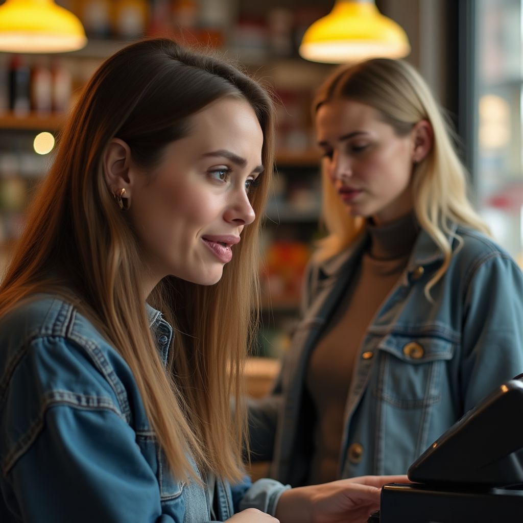 Женщина резко подняла голову, встретившись взглядом с незнакомкой. В этот момент время будто остановилось: в торговом зале раздался приглушённый шум и шёпоты. «Кто вы?» — голос женщины дрожал, но в нем звучала смелость, рожденная отчаянием.