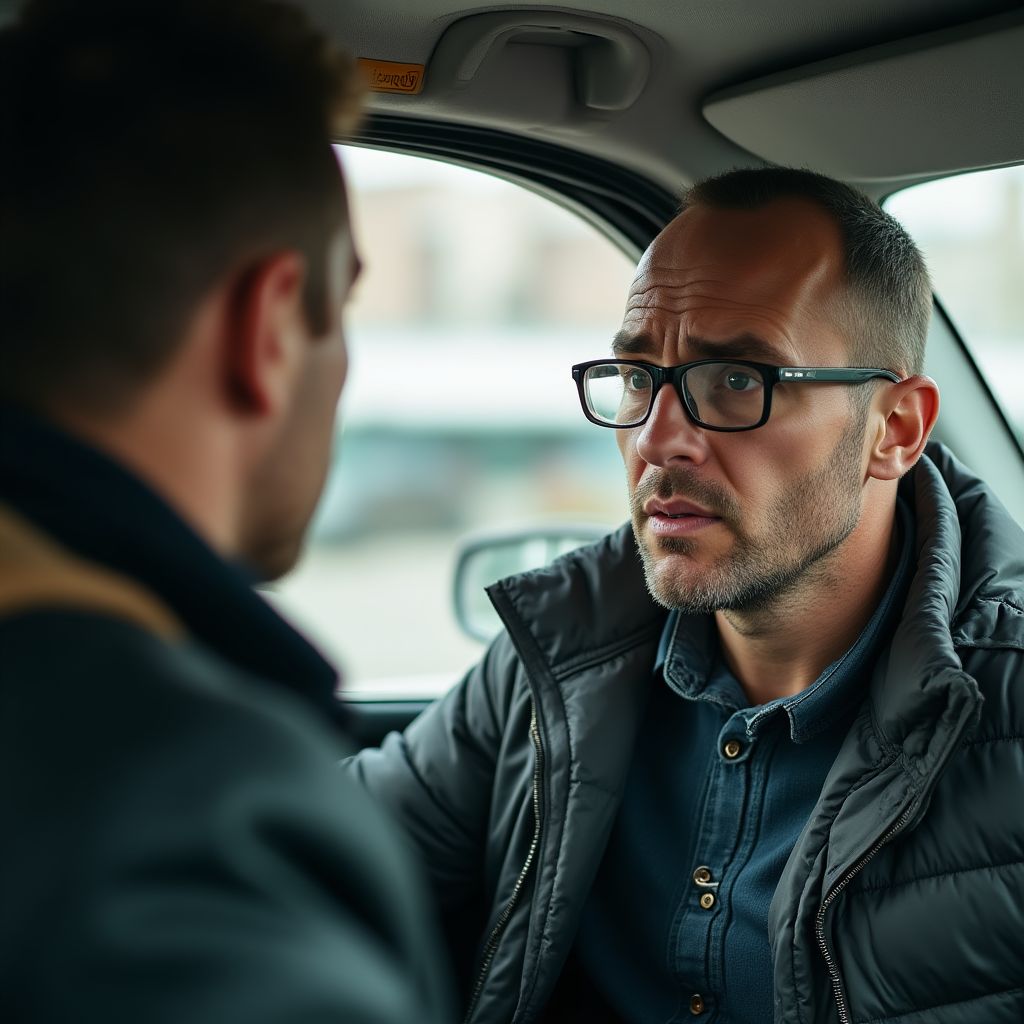 — «Ты серьёзно?» — спросил пассажир с недоверием, глаза расширились от неожиданности. — «Почему ты никогда не рассказывал?»