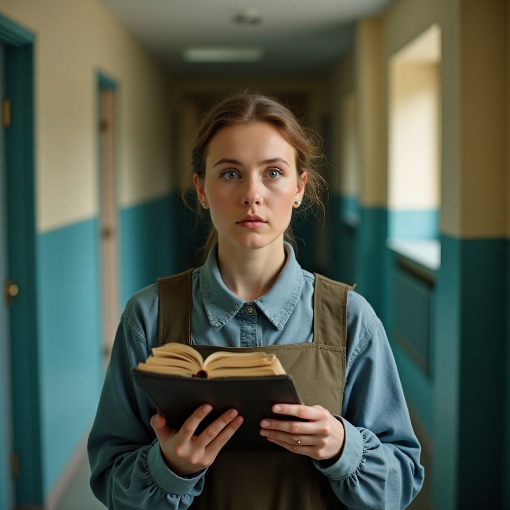 Анна — высокая женщина с усталыми зелёными глазами и скрипучим голосом — медленно шла вдоль коридора. Ее форма — простое синее платье уборщицы, слегка выцветшее и уже не первой свежести, — едва скрывала худощавую фигуру, согнутую от лет неприметной работы. В руке она держала ведро, наполненное водой с запахом лимона и хлорки, а на ногах скрипели старые резиновые тапочки. В её душе жила усталость и привычка к одиночеству, ведь работала она здесь уже много лет, оставаясь незаметной для большинства учеников и персонала.