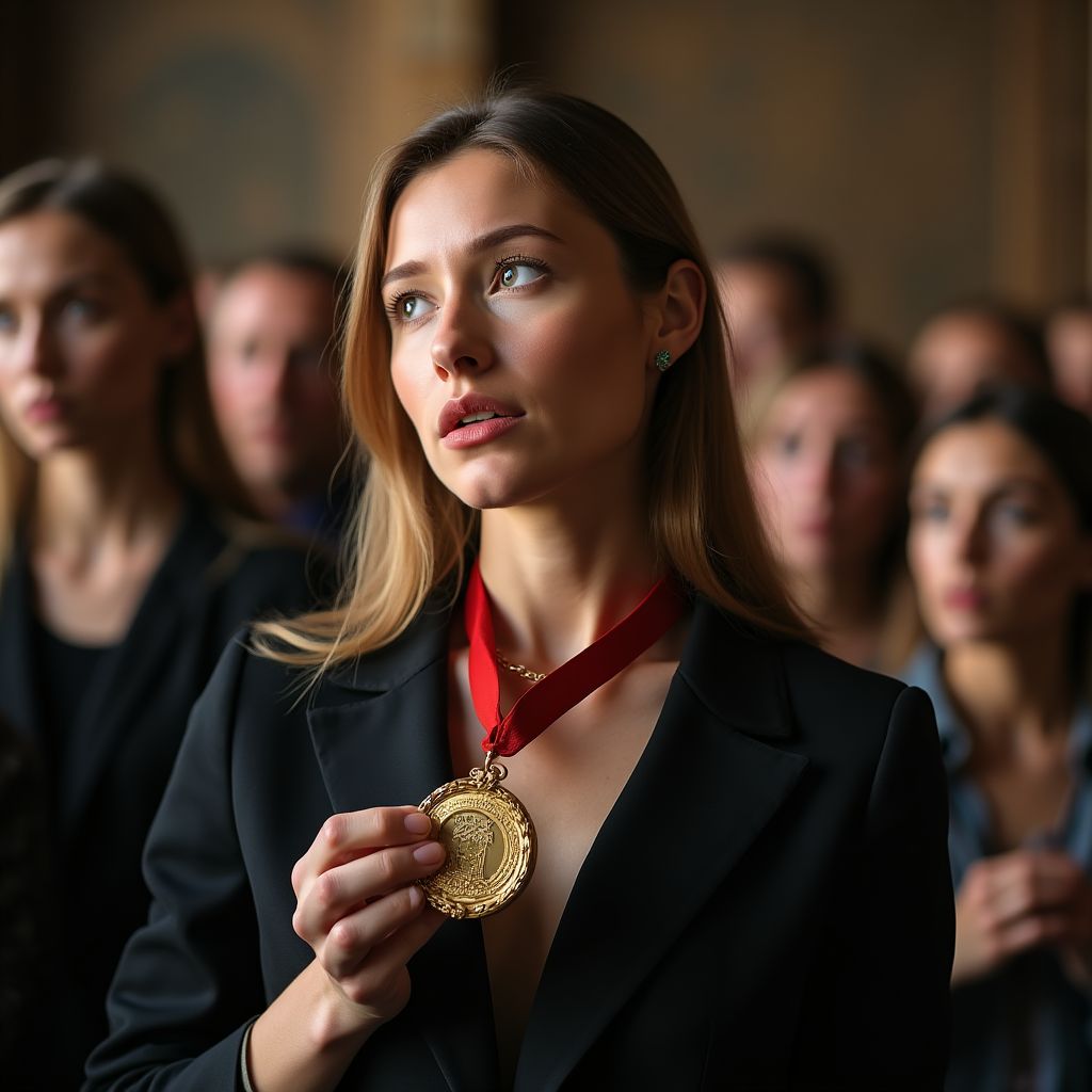 «Почему именно я?» — думала она, глядя на зал и слушая приглушённые разговоры. Мысли метались между волнением и сомнением, сердце билось учащённо, словно предчувствуя перемену. Она пришла сюда не ради похвалы — слишком много темных страниц оставалось в её прошлом, которые никто не должен был раскрыть. Но слушая чужие шёпоты и взгляды, чувствовала, как тяжесть социальной пропасти стала камнем на душе. Её решение стоять здесь сегодня было проявлением не только мужества, но и внутренней борьбы с собственными демонами.