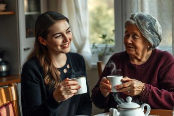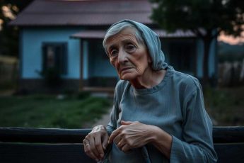 An elderly woman sits on a bench opposite the house that is no longer hers. Grandma Ann rests on the