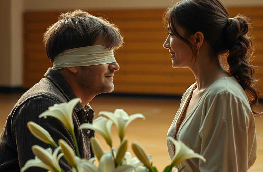 Emily eyes him skeptically but consents. James guides her gently, supporting her elbow. Inside a building, the scent of fresh paint hits her nose.