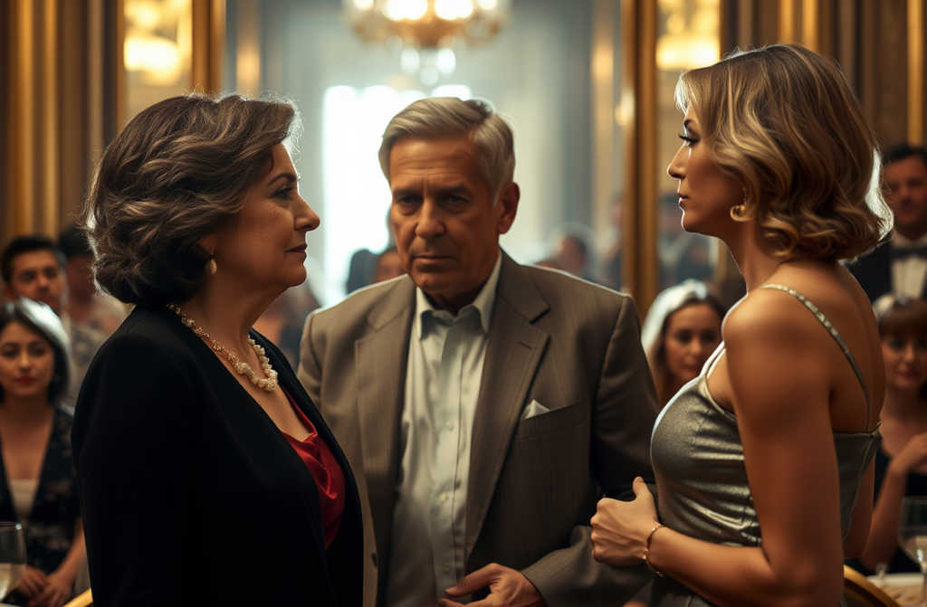 They walked out, guests watching in stunned silence. At the doorway Marian glanced back. Sophie stood alone, baffled, while Ian stared at his shoes.