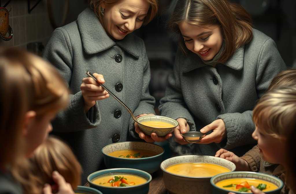 Jeden Tag kochten die Schwestern einmal Suppe, rührten und brauten unermüdlich, fügten heimlich das ein, was noch im Haus zu finden war, denn das Essen war knapp. Das Ergebnis war eine köstliche Suppe, die alle Kinder zur gleichen Uhrzeit verzehrten. Sie nannten sie Schlitzohr.