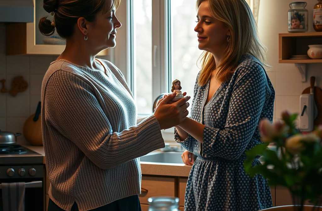 On the table sat a small, elegant porcelain figurine two women holding hands tied with a ribbon and a note: True friendship survives trials. I hope ours does. Love, Emily.