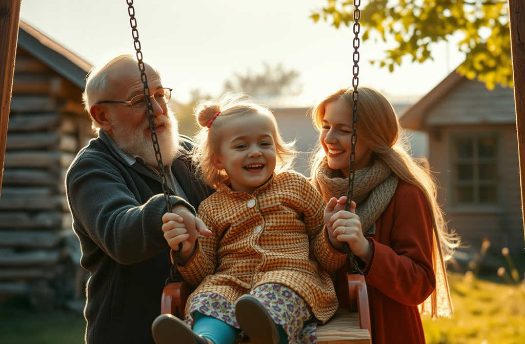 Almudena creció y empezó a ir a la escuela. Un día, sentada en el porche, observó a su tío Ignacio trabajando, y luego fue a casa de su amiga vecina. Al volver al anochecer, al abrir la puerta del patio quedó sorprendida: en medio del jardín había columpios recién instalados.