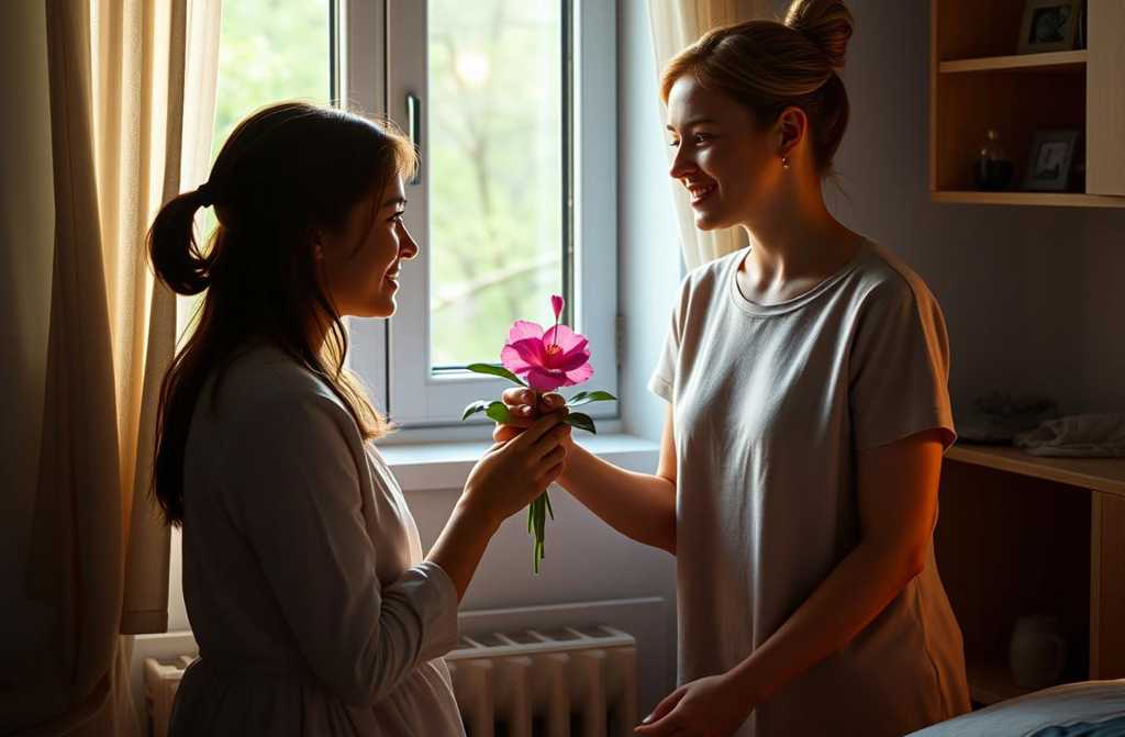 Alicia entra con una planta de hojas largas y estrechas, la posa en el alféizar y, con una sonrisa amable, la mira fijamente.