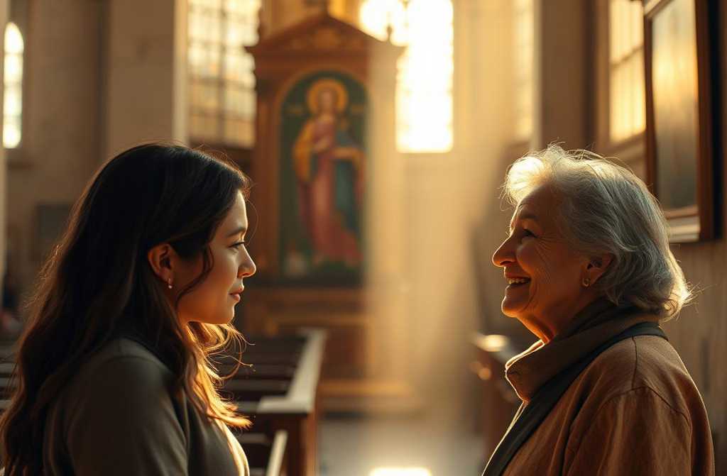 A quiet service was underway. Few were there. She moved forward, eyes landing on a large painting of a young woman cradling an infant. Emily couldnt look away.