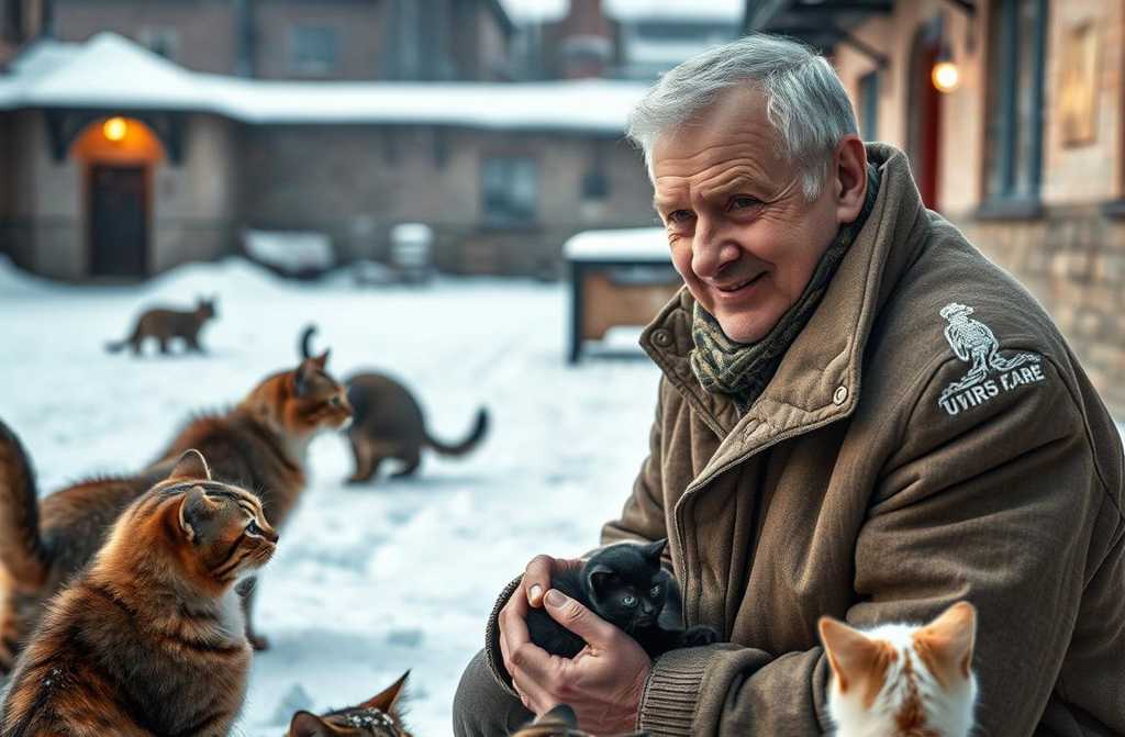 George, wary of the gang, fetched a piece of sausage and handed it to the kitten, placing smaller bits a short distance away for the others. The other cats lunged at their treats, while the kitten lingered, nosing Georges hand before finally nibbling.