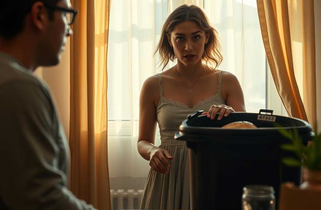 Standing by the kitchen table, lifting the lid of the rubbish bin, Emily suddenly froze. «Oh, *this* old dress! Are you telling me *I* put it here?»