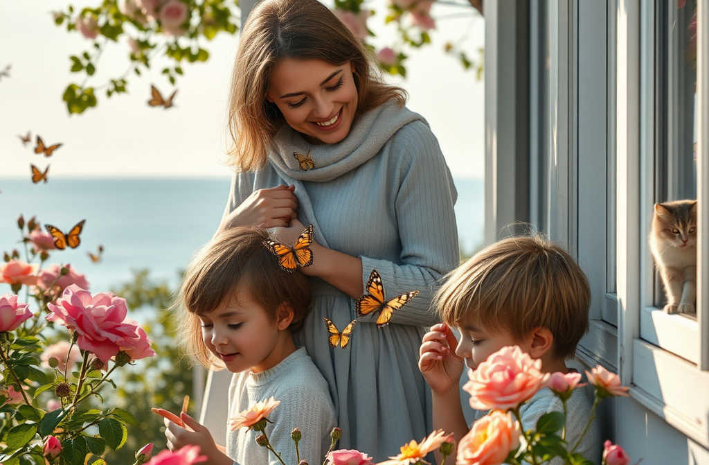 Outside the window the sea rolls, roses bloom in the garden, filling the air with a light perfume. A fluffy cat naps on the windowsill, opening its eyes only for the passing gulls.