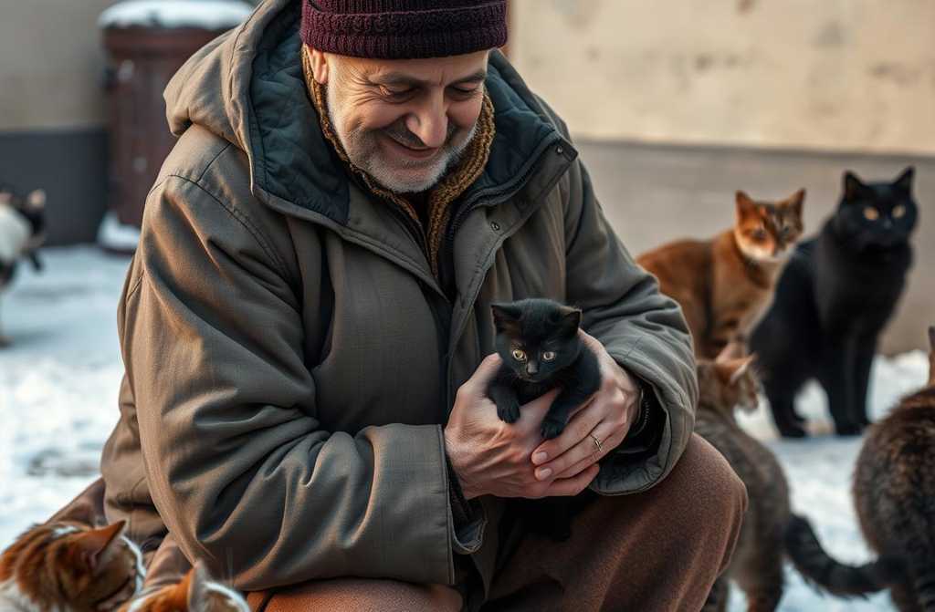 Sergio, algo receloso, tomó al pequeño y le ofreció un trozo de salchicha. Los demás felinos se acercaron hambrientos, pero el gatito se quedó pegado a sus manos, absorbiendo cada caricia antes de comer.