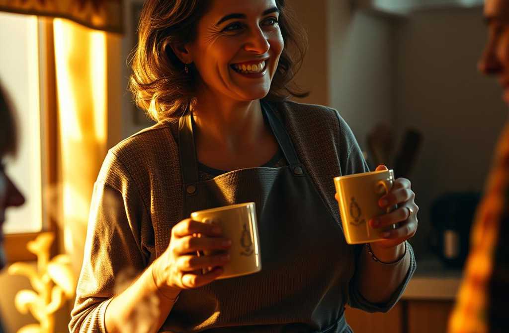 The warm glow of the evening sun bathed the kitchen where Emily was cooking dinner. The comforting aroma of shepherds pie and freshly baked scones filled the air.