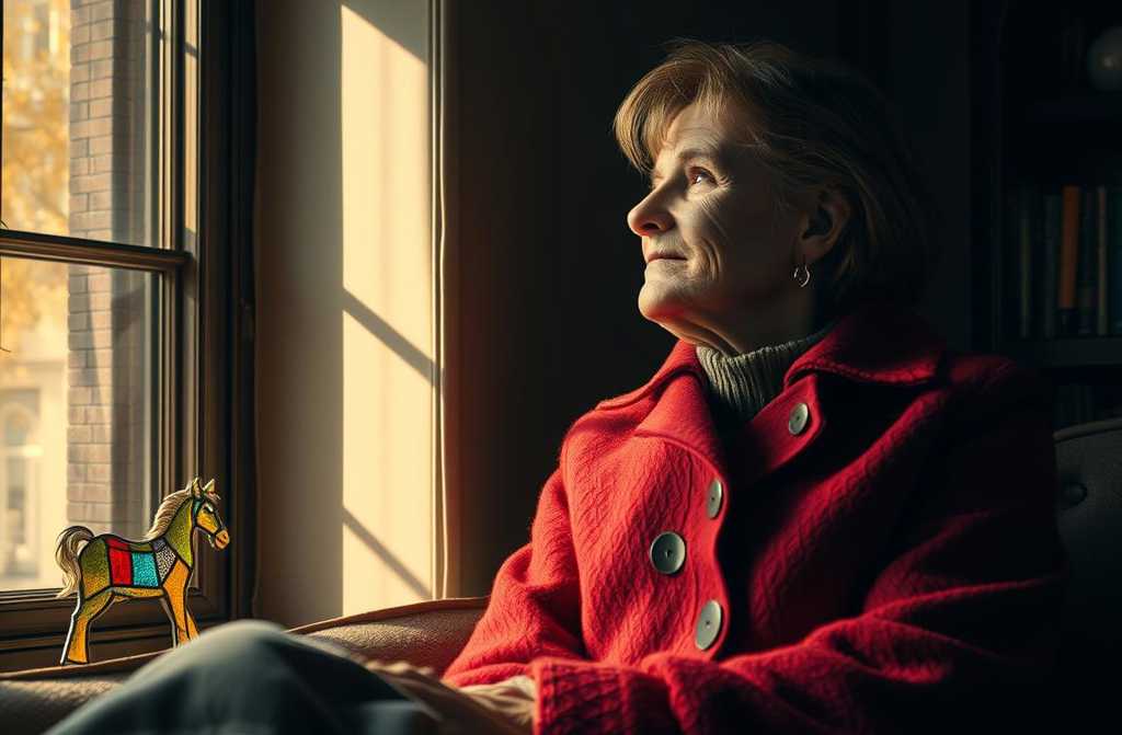 One evening, passing a shop window, she saw a small stained-glass horsevibrant, delicate.