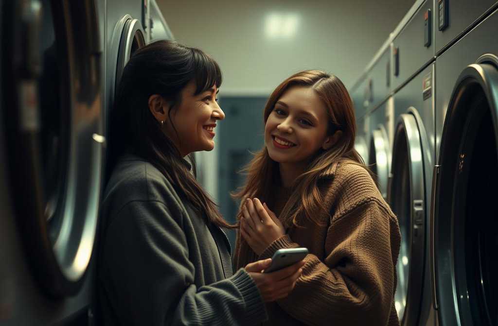 Her words sound almost casual, yet they land with precision; the gentle rumble of the washers and the steady rhythm of the drums give everyone a brief respite.