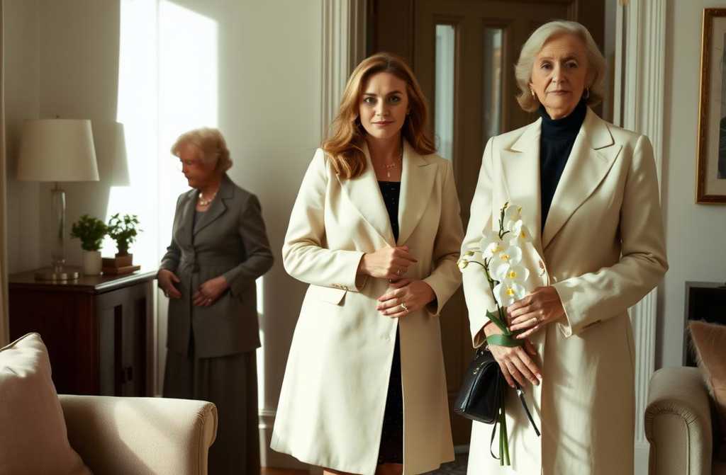 One morning, the doorbell rang. There stood my motherin a cream Burberry coat, a Louis Vuitton suitcase in hand, a bouquet of white orchids cradled in her arm. Hair perfect, makeup flawless, gaze steady.
