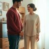 Sie halten sich fest, während draußen Schnee fällt und das Haus warm und behaglich ist.
