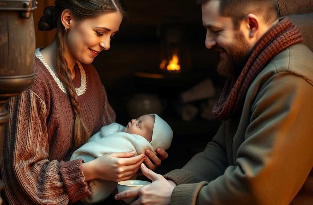 Im Haus steht das Kinderbett, die Wiege, ein Berg von Kleidung für das Baby. Niklas sitzt am Tisch, hat den Kopf in den Händen, schläft. Er hebt den Kopf, als er Lena sieht rotgeface, zerzaust, das Kind im Arm, der Rock bis zu den Knien nass, die Füße tief im Schlamm. Beim Anblick rennt er zu ihr, nimmt das Kind und legt es ins Bett, holt heißes Wasser aus dem Kessel, hilft beim Ausziehen, wäscht die Füße. Während Lena sich über dem Herd umzieht, steht bereits gekochte Kartoffeln, ein Stück Brot mit Milch auf dem Tisch.