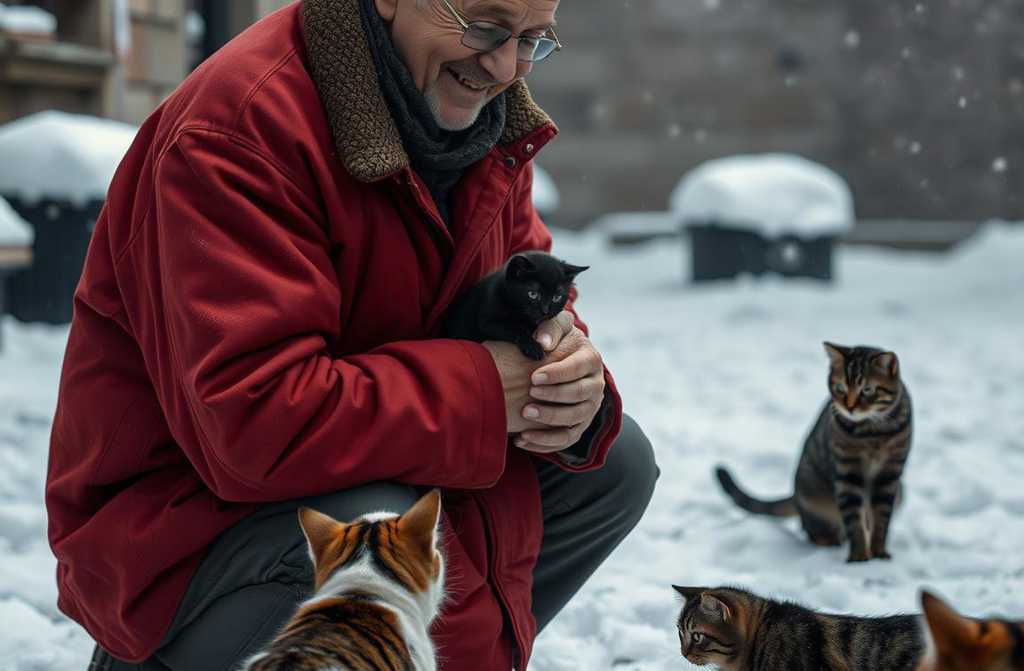 Soon a flock of fluffy felines surrounded him, and two crows perched on the fence, curious about the spectacle. Snow kept falling, thickening.
