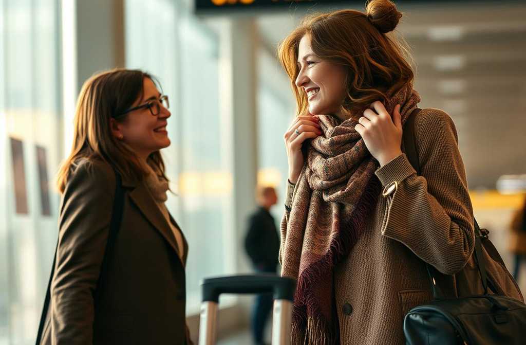 Behind her stood a woman a decade older, her dark coat buttoned neatly, a scarf wrapped snugly around her neck. A travel bag with an airline tag dangled from her arm. She held herself calmly, her eyes flicking between departure boards and strangers in line.