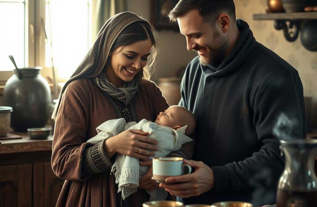 Inside, a baby cot and a pram sit by a pile of clothes. Nicholas is slumped over a table, asleep. He stirs, looks up, and sees Ethel, cheeks reddened, hair dishevelled, the baby swaddled in her arms, her dress soaked and mudcaked to the knees. He rushes over, lifts the child onto the cot, fetches a kettle of hot water, helps her out of the mudsoaked boots, and washes her feet. While she changes, a pot of boiled potatoes and a jug of fresh milk sit on the stove.