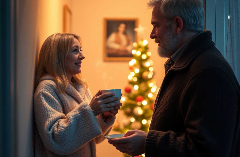Back in her flat, the man places the tree modestly in the hallway and strips off his coat. Each step looks painful; hes clearly chilled.