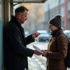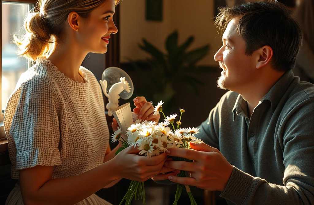 Al terminar la tarde, Antonio acompaña a María a la parada del autobús. Le entrega un pequeño ramillete de margaritas del puesto de la esquina.