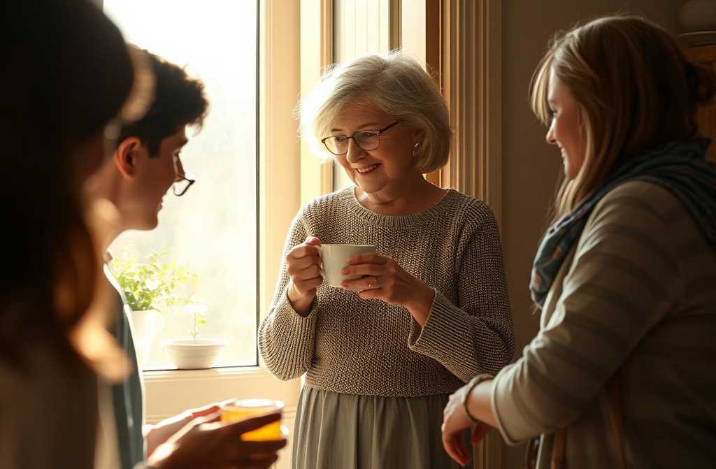 Michael and Olivia are in the kitchen. Their mother has already poured tea into mugs and sliced a sponge cake she baked before coming.