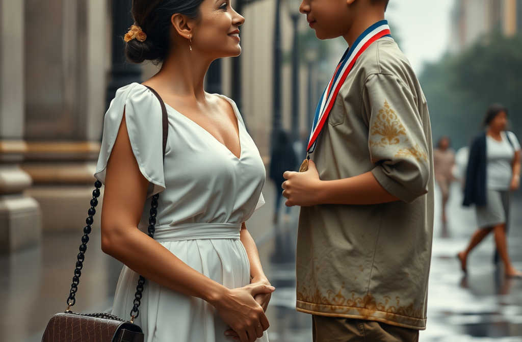 Vestía un impecable vestido blanco de diseñador, reflejo de riqueza y control. Al aproximarse a las puertas de cristal, la calle bullía de paraguas y destellos de cámaras.