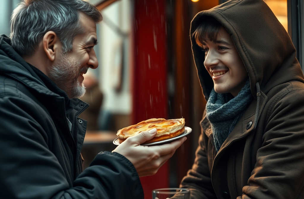 They fall silent. At the counter the waitress slices a fresh cake, and the smell of warm pastry drifts back into the room. Outside, Andys silhouette appears under the awning, hood pulled up, scrolling his phone. Deciding, Ian rises.