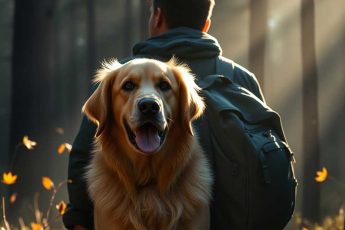 **A Dogs Loyalty** Exhausted, the dog stumbled out of the woods with a backpack strapped to his side.