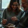 Он стоял у входа, сгорбившись, в просторном старом пальто, которое давно потеряло форму, и с завязанной коробкой под мышкой. Его рост казался уменьшенным от усталости, глаза — тусклыми, с тёмными кругами, пальцы облупленные, ногти с чёрной грязью; дыхание облачком белого пара вырывалось при каждом слове. На затылке седая щетина, на губе — маленький шрам, и при всем этом он держал коробку с трепетом, как человек держит самое драгоценное, что у него осталось. В его позе читалось одно: он чужой здесь, но пришёл с намерением.